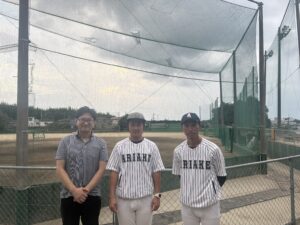 (左から)弊社代表・斎藤/有明高校野球部 西コーチ、中野部長